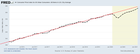 The following chart shows the natural log of the median CPI. When using natural logs, constant exponential growth is seen as a straight line. I have added a trend channel in red.